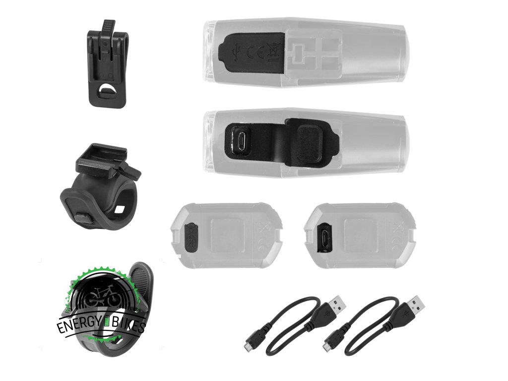 Sada obsahuje výkonnú prednú baterku „Shark“ nabíjateľnú cez USB, ktorá je vybavená vysoko svietivou